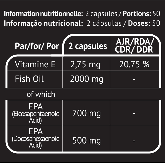 OMEGA 3 ÉVOLUTION contiene una dosis poderosa de EPA 700mg y DHA 500mg.