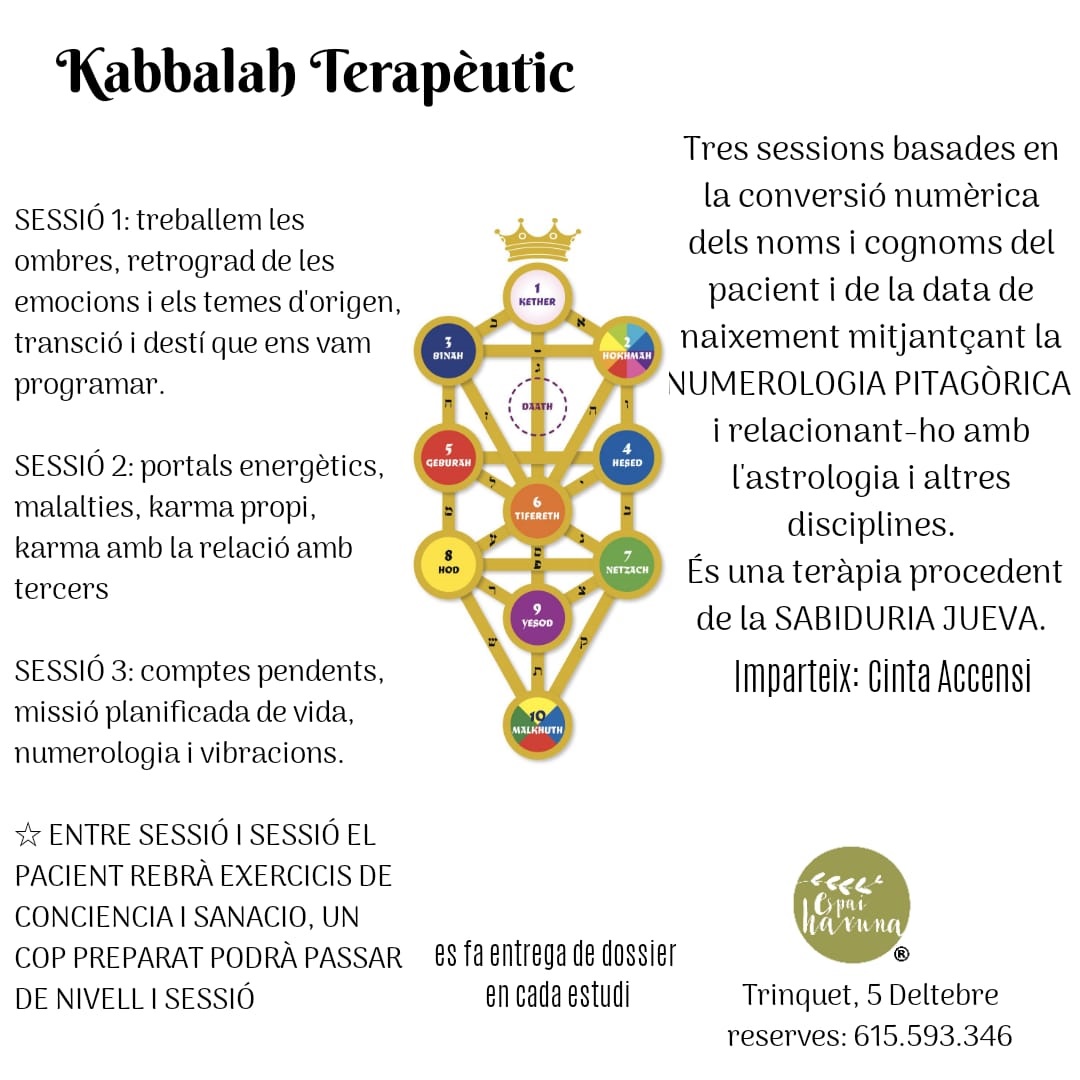 Terapia procedente de la sabiduría jueva. Tres sesiones basadas en la conversión numérica de los nombres y apellidos del paciente y la fecha de nacimiento, mediante la numerología Pitagórica y relacionándolo con la astrología y otras disciplinas.