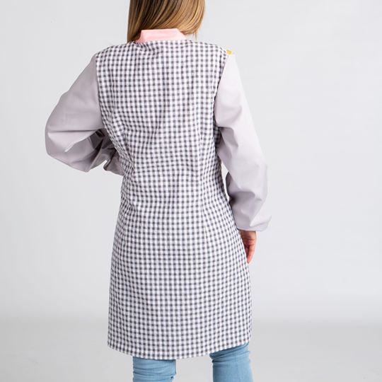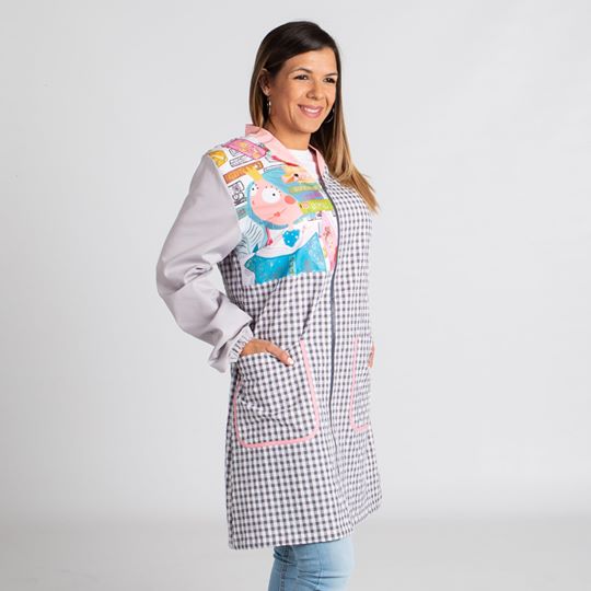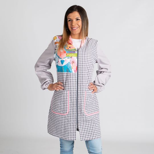 Bata de maestra con estampado de hada en la parte frontal superior, tejido vichy bambula de color gris con cierre de cremallera y cuello color rosa en V. 2 bolsillos laterales, con ribete rosa. Mangas de color gris. Gomas en los puños y pinzas en sisa y espalda para mayor comodidad. Composición 65% Algodón, 35% Poliéster. Su tejido permite un lavado, secado y planchado fácil y rápido. Disponible en las tallas XS, S, M, L, XL y 2XL. Mirar tabla de medidas.