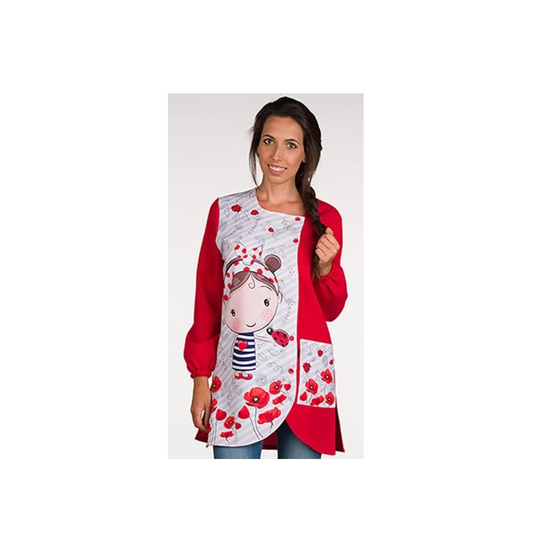 Bata de maestra de manga larga y color rojo con estampado de niña con amapolas y mariquitas. Cierre con botones delanteros de color rojo y gomas en los puños. Composición 100% poliéster. Su tejido permite un lavado, secado y planchado fácil y rápido. Diferentes tallas.