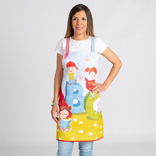 Estola letras ABC, estampados de niños con letras ABC, espalda con bambula de caudros rojos, y tirantes bicolor, confeccionada con poliéster 65% poliester y 35% algodón, tejido suave, fresco y con caída de fácil lavado y secado. No necesita planchado. Tiene un bolsillo central a la altura de la cintura con el mismo estampado. Talla única, ajustable.