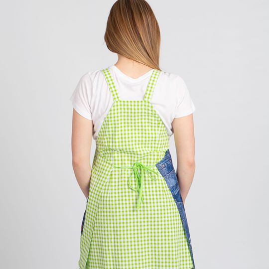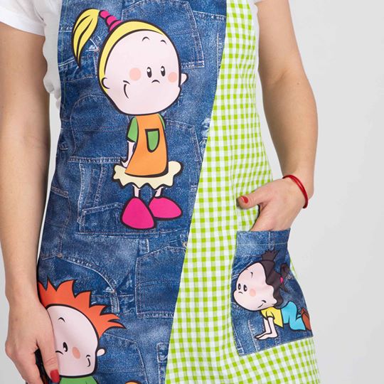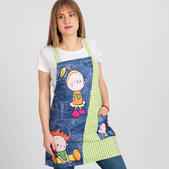 Estola de maestra de color verde manzana, dibujo delantero derecho con estampados de bolsillos tejanos y niños. Pinzas en espalda para mayor comodidad. 1 bolsillos en el lado izquierdo estampado. Talla única, modelo ajustable mediante cintas y adaptable desde la talla XS a la 2XL. Composición 65% Algodón 35% Poliester.