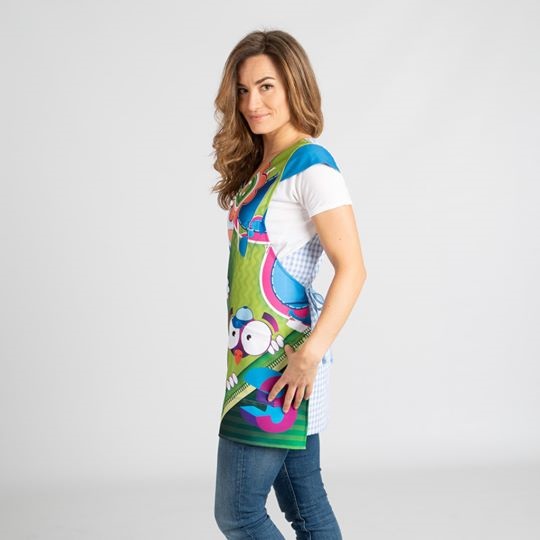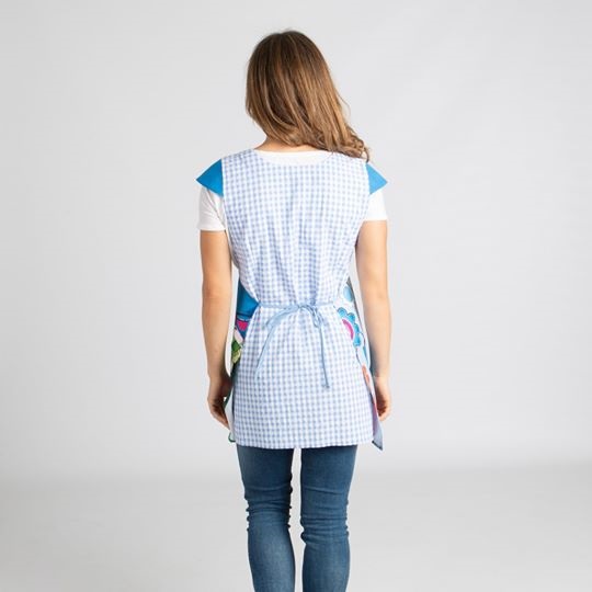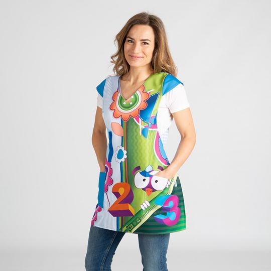 Estola de maestra modelo patchwork, combina el color azul en la espalda con tejido de bambula, con estampados llamativos en la parte frontal. Confeccionada con 65% poliester 35% algodón tejido suave, fresco y con caída de fácil lavado y secado. No necesita planchado. Tiene dos bolsillos delante a la altura cintura. Talla única, ajustable, abarca desde una talla XS a la XL.