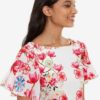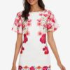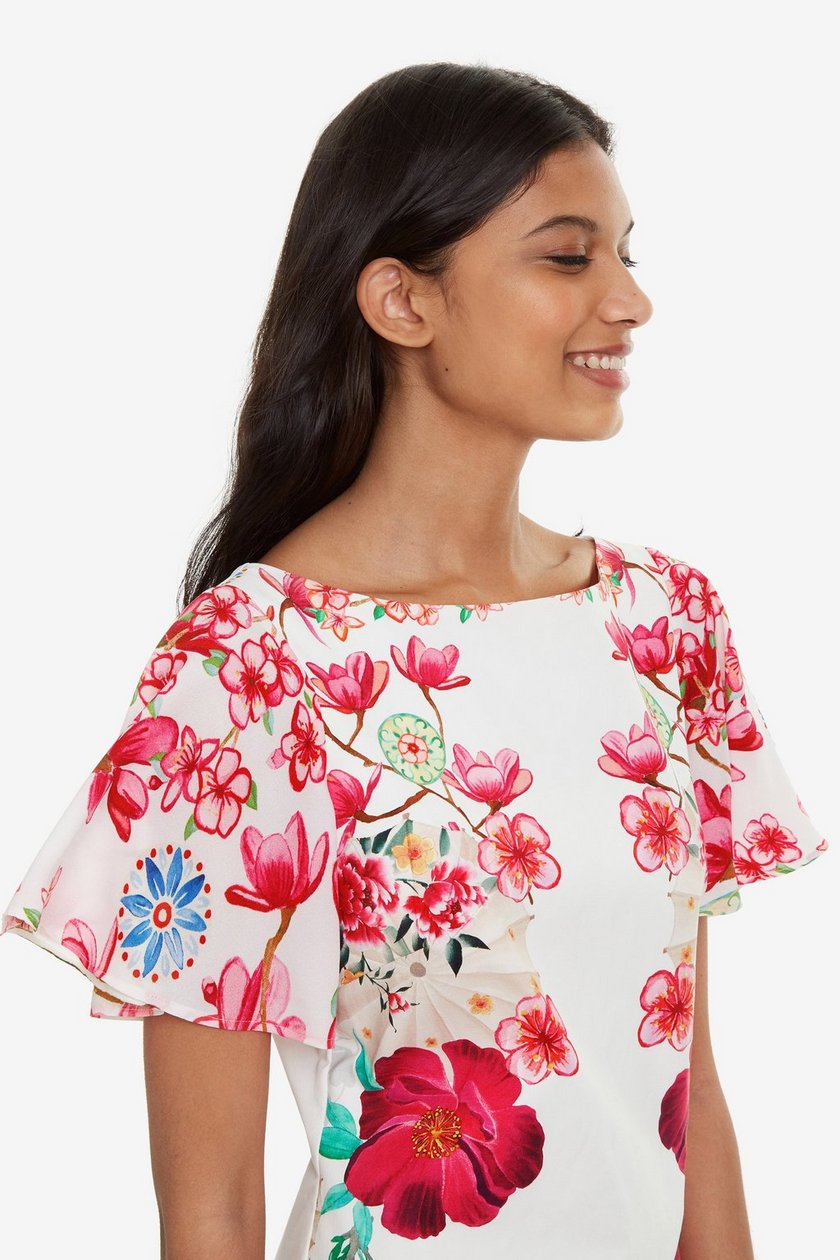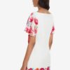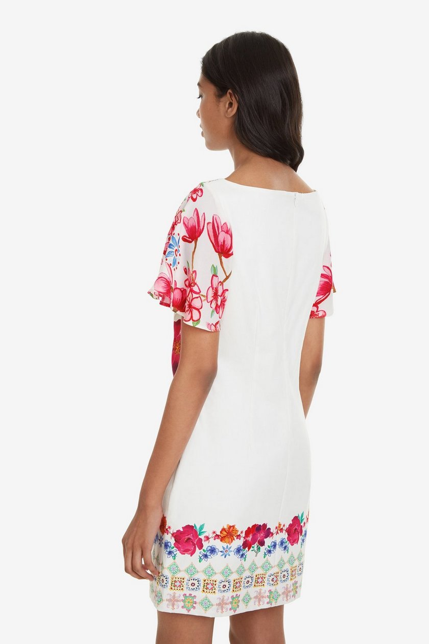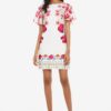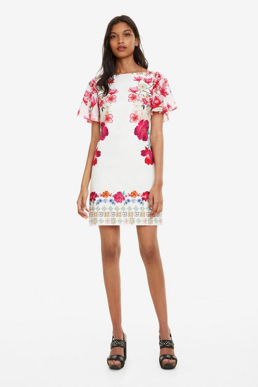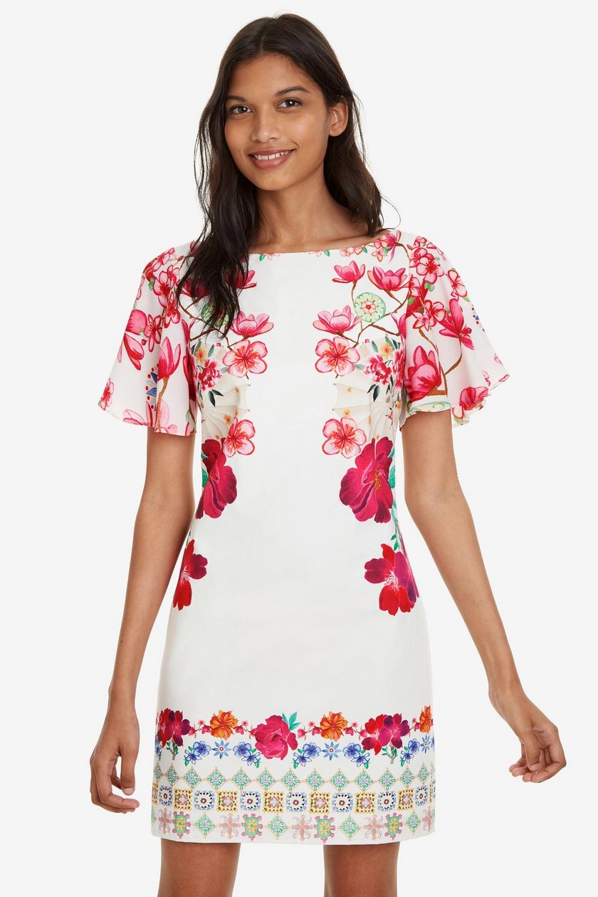 Vestido,de la marca Desigual, blanco de cuello barco y de patrón ajustado, adornado por el colorido de las flores de un cerezo japonés y con cenefas a modo de mosaico remarcando el bajo de la prenda. La manga corta del vestido avolantado le da un aire coqueto y muy femenino. Composición exterior 90% COTTON 8% POLYESTER 2% ELASTANE, Composición interior 96% ALGODON 4% ELASTANO