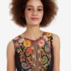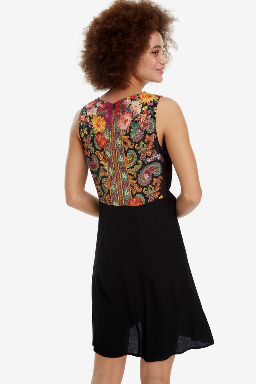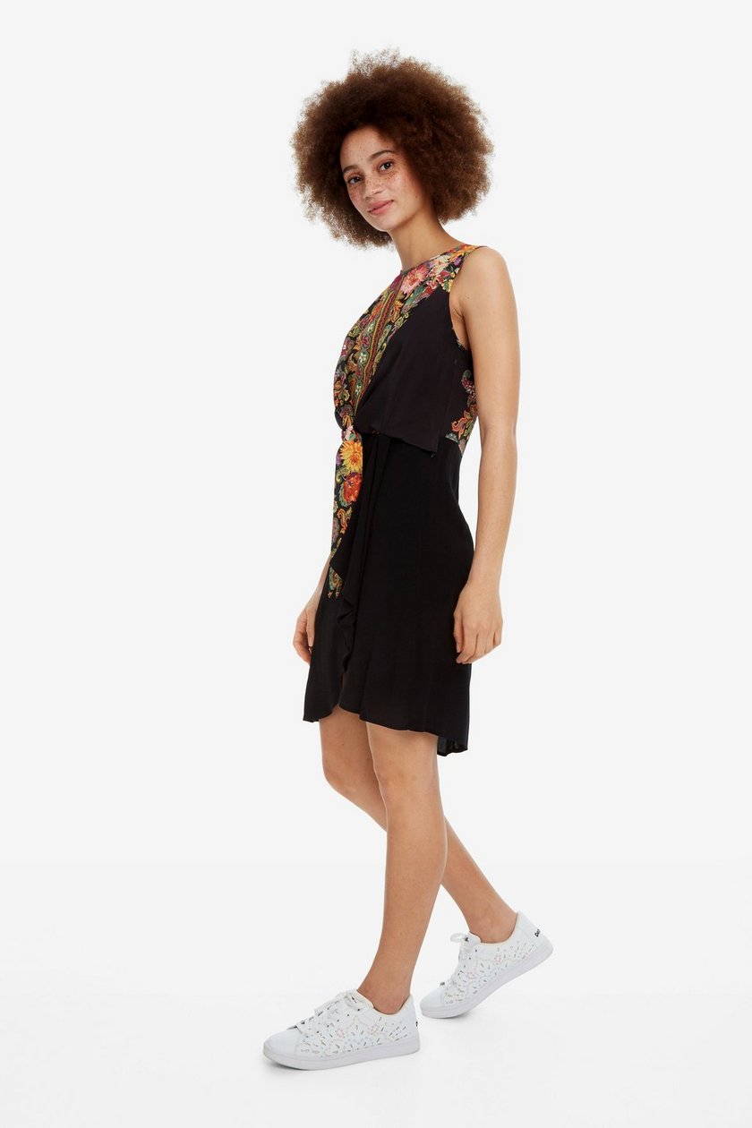 Vestido corto de patrón slim, de la marca Desigual, con cuerpo estampado a modo de chaleco. La parte delantera del mismo tejido floral puedes anudarla de manera frontal o lateral. Combínalo con zapatos y botines negros de tacón tanto para ir a trabajar o como para ir a una cena con las amigas. Composición exterior 100% POLIESTER