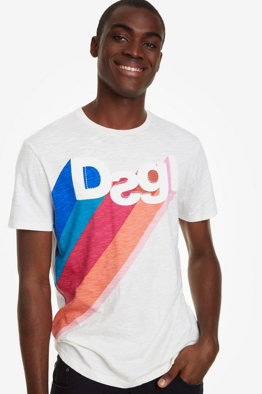 Camista blanca de hombre, de la marca Desigual con estampado de colores desigual en el pectoral.