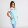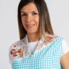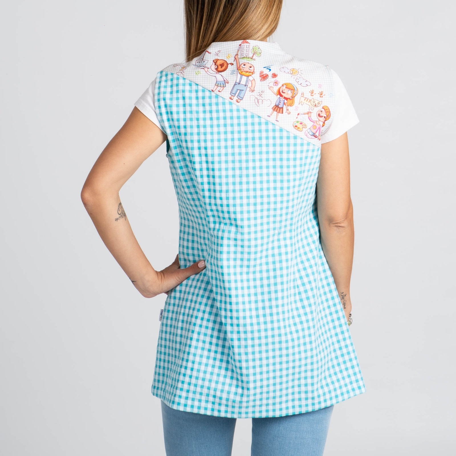 Blusa sin mangas de maestra con tejido vichy azul turquesa y estampado de dibujos en canesú y espalda. Prenda semi ajustada con pinzas en pecho y espalda para mayor ajuste y comodidad, cuello acabado en V y cremallera central delantera de color turquesa. Dos bolsillos delanteros de gran capacidad. Tejido Vichy 165gr./m². Composición 65% poliéster-35% algodón. Tallas de XS a XXL. Personalizamos con bordados